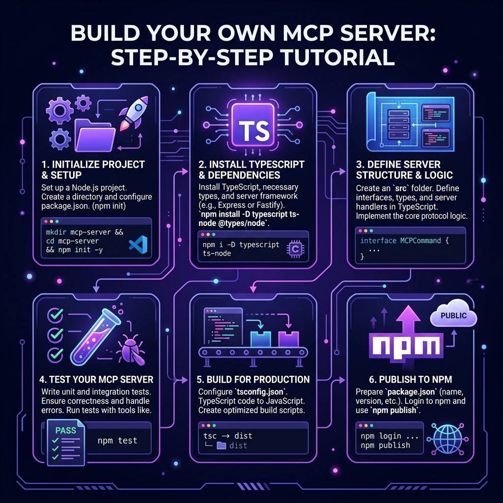 Step-by-step TypeScript tutorial for building an MCP server from scratch. MCP SDK setup, tool definitions, testing with MCP Inspector, and publishing to npm.