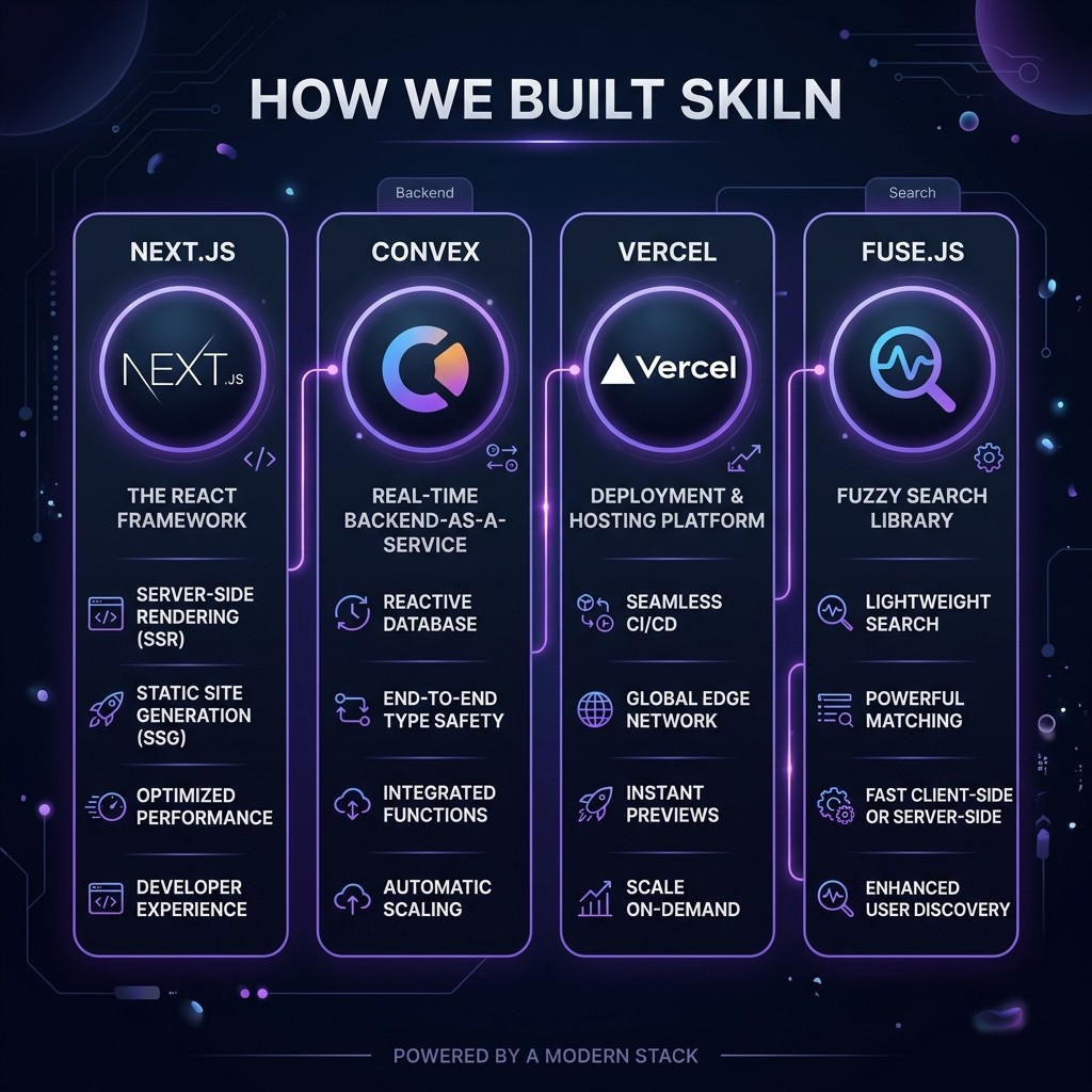 Skiln.co is built on Next.js 15 with the App Router, Convex as the real-time database, Vercel for hosting and deployment, Fuse.js for client-side fuzzy search, and Tailwind CSS for styling. The data pipeline uses Python scrapers pulling from 11 different sources including GitHub repos, npm registries, and community-maintained lists.